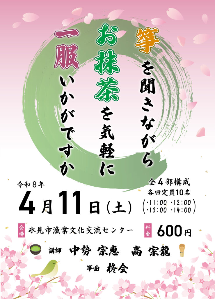 【4/11㈯ 箏を聞きながらお抹茶を気軽に一服いかがですか】