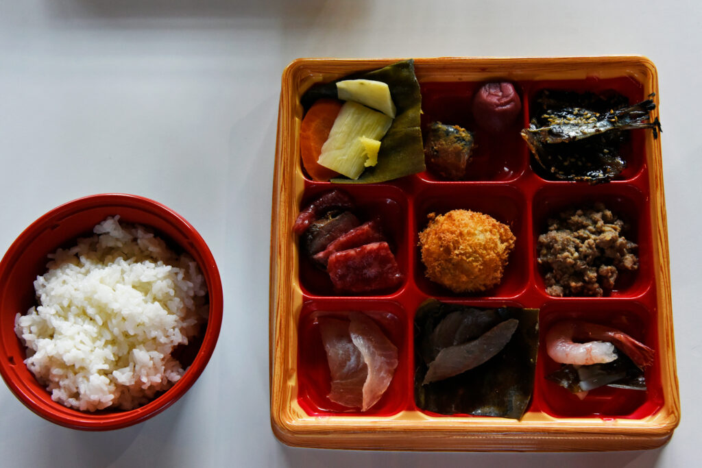氷見の食材を使用したお弁当で、氷見でのジビエを使用したひき肉や、氷見牛の昆布締めなど豪華食材も混じった美味しそうなお弁当です。